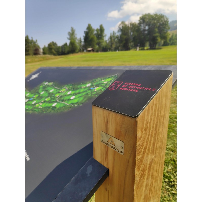 Fabrication : Robinier massif (classe 4 naturel), Signalétique an alliage de Compact HPL aspect Pierre sur 2 faces usiné avec encastrement d'Alu composite avec lamination anti UV 5 ans,